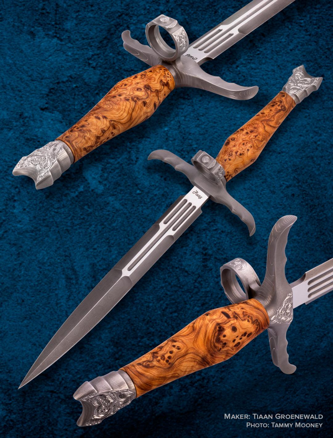 The dagger was made with Damascus(blade, guard and pommel) I used Wild olive for the handle material and all engraving was done by Julien Marchal.